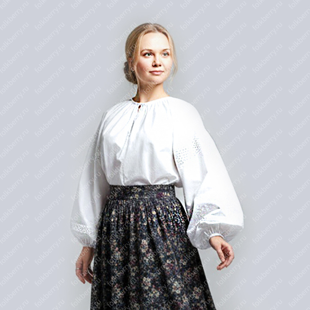 Блуза выполнена из белого шифона. Пышный рукав, по запястью  волан.  Декор золотистого или серебристого цвета.