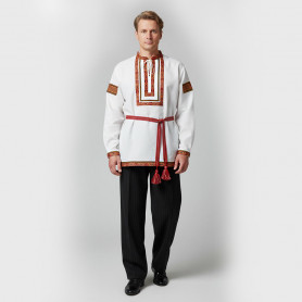Рубаха "Василёк" выполнена из габардина белого оптического цвета. Декором косоворотки стали большие по размеру вставки из хлопка с цветочным рисунком в сине-голубом цвете и вьюн синего цвета. С Косоворотка без воротника-стойки удобна при надевании на верхнюю одежду (на зимних мероприятиях). Косоворотка "Василек" и сарафан с блузой "Гжель" подойдут для участников одного ансамбля.