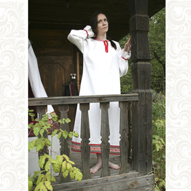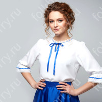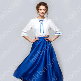 Блуза может быть выполнена из белого атласа (более праздничный вариант) или из хлопка. Пышный рукав по запястью присборен резинкой и имеет декоративный манжет из жаккардовой тесьмы.