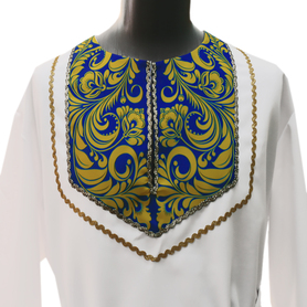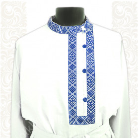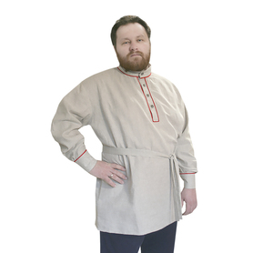 Ткань - лен небеленого цвета, плотный, мягкий, качественный. Декор, жаккардовая тесьма шириной 3 см, располагается, согласно традиции, вокруг шеи, по груди с левой стороны, на рукавах, поясе, по низу косоворотки.