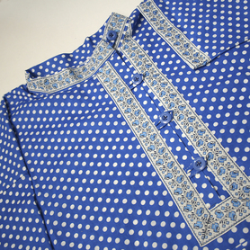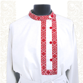 Сшита косоворотка из льняной ткани, скомбинирована из двух цветов – основной и красной по низу рукава и рубахи. Декорирована по вороту и груди жаккардовой тесьмой. Выглядит праздничной, яркой и нарядной.