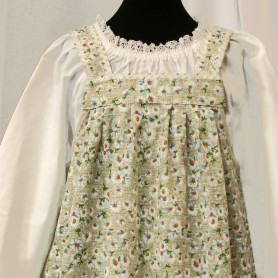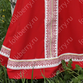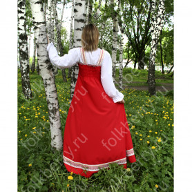 Эта традиционная женская рубаха ( длинная туника с поликами под мышками, с разрезами по бокам, с поясом) из белого льна. Декорирована по низу рукава, подолу и на груди широкой жаккардовой тесьмой с гжельскими мотивами сине-голубого цвета на белом фоне.