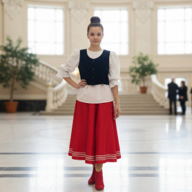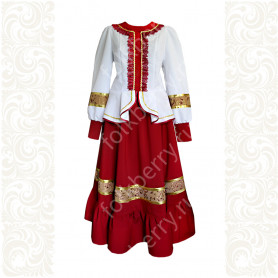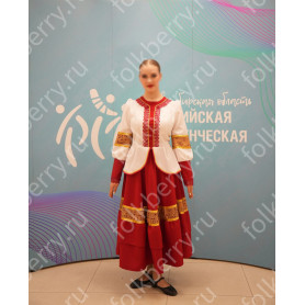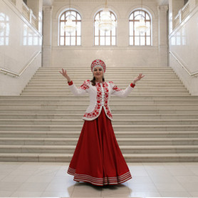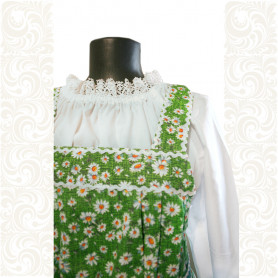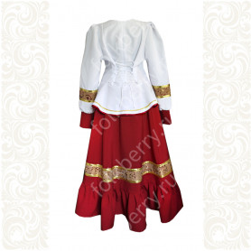 Эта традиционная женская рубаха ( длинная туника с поликами под мышками, с разрезами по бокам, с поясом) из белого льна декорирована по низу рукава, подолу и на груди широкой жаккардовой тесьмой со славянскими обережными символами красного цвета на белом фоне.