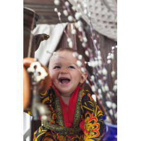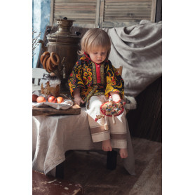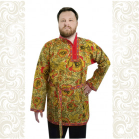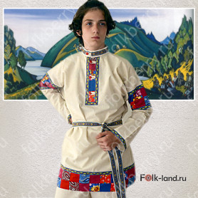 Мужская рубаха «Истоки» выполнена из хбелого льна, имеет втачной рукав. По низу изделия, вороту и рукавам расположена жаккардовая тесьма с обережным рисунком. Дополняет рубаху кушак (пояс) из ткани с тесьмой.