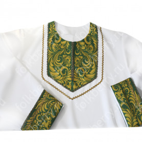 Блуза может быть выполнена из белого атласа (более праздничный вариант) или из хлопка. Пышный рукав по запястью присборен резинкой и имеет декоративный манжет из жаккардовой тесьмы.
