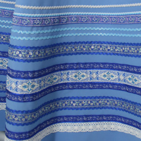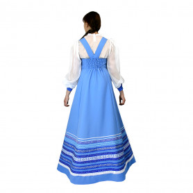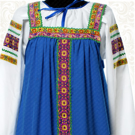 Приталенная модель хорошо сидит по фигуре, расклешенная книзу дает крупные мягкие волны. Сзади расположена застежка «молния». Талия дополнительно подчеркивается поясом. Плечики регулируются по длине. Сарафан украшен широкой полосой из жаккардовой тесьмы, вьюнка, золотистого шнура, кружева.