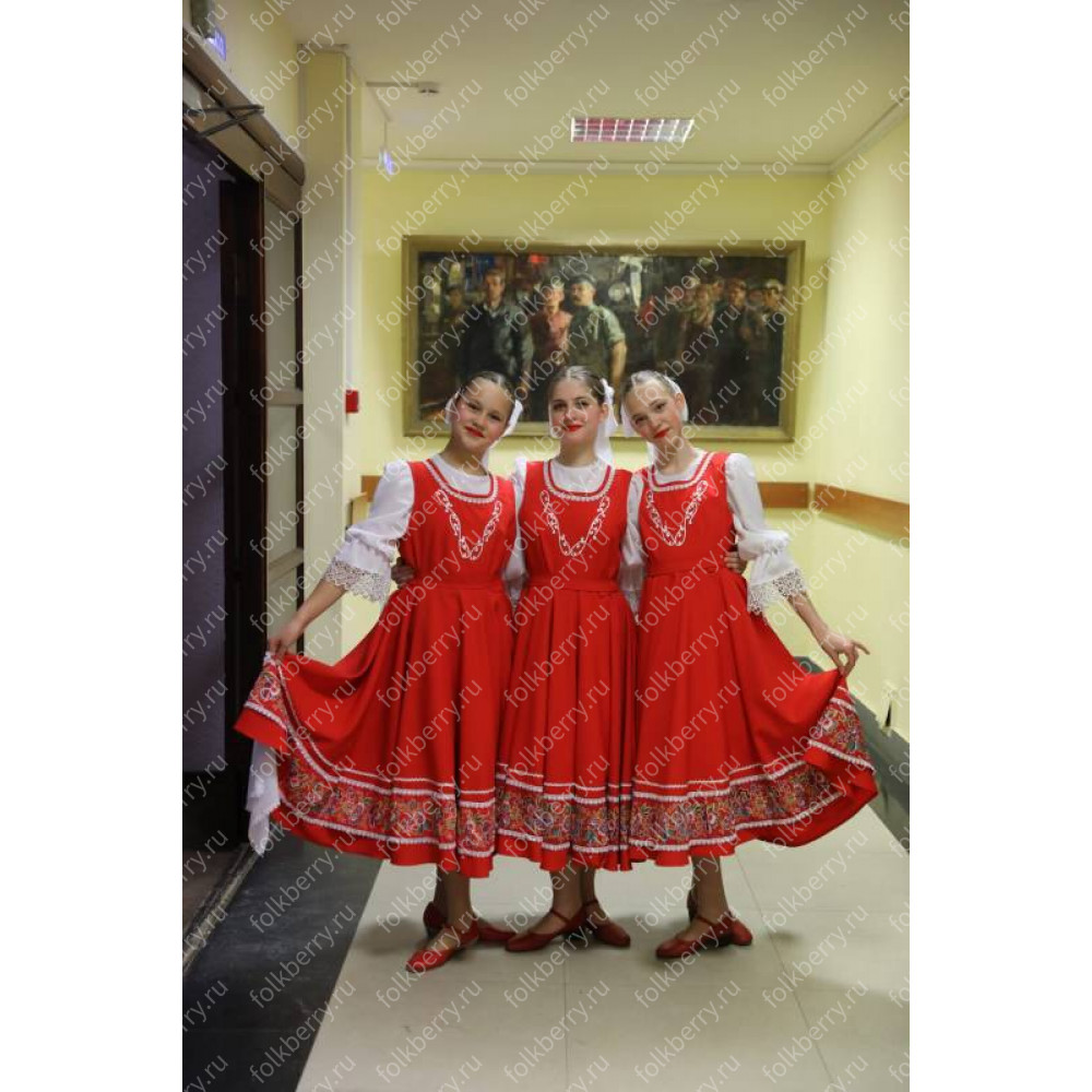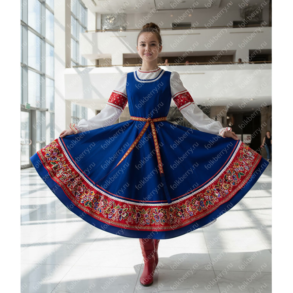 Сарафан с блузой «Плясовой» – яркий наряд в духе народных традиций. Оригинальный дизайн, красивые оттенки синего, бирюзового, белого цветов, качественное исполнение комплекта порадуют Вас. Это хороший выбор для участников танцевально-театральных коллективов.