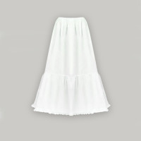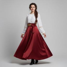 Костюм выполнен из габардина и красиво подобранного декора в золотистых цветах. Достоинства габардина в том, что он не мнется, не блестит, как атлас, ложится красивыми мягкими складками, цвет не выгорает. Юбка с оборкой, декор в золотистых цветах, по талии на двойной резинке. Блуза белого праздничного цвета, с баской, рукава расширены внизу, с манжетами. Сзади на блузе шнуровка. Она дает хорошую посадку по фигуре. Костюм предназначен для творческих сольных и коллективных театральных выступлений.